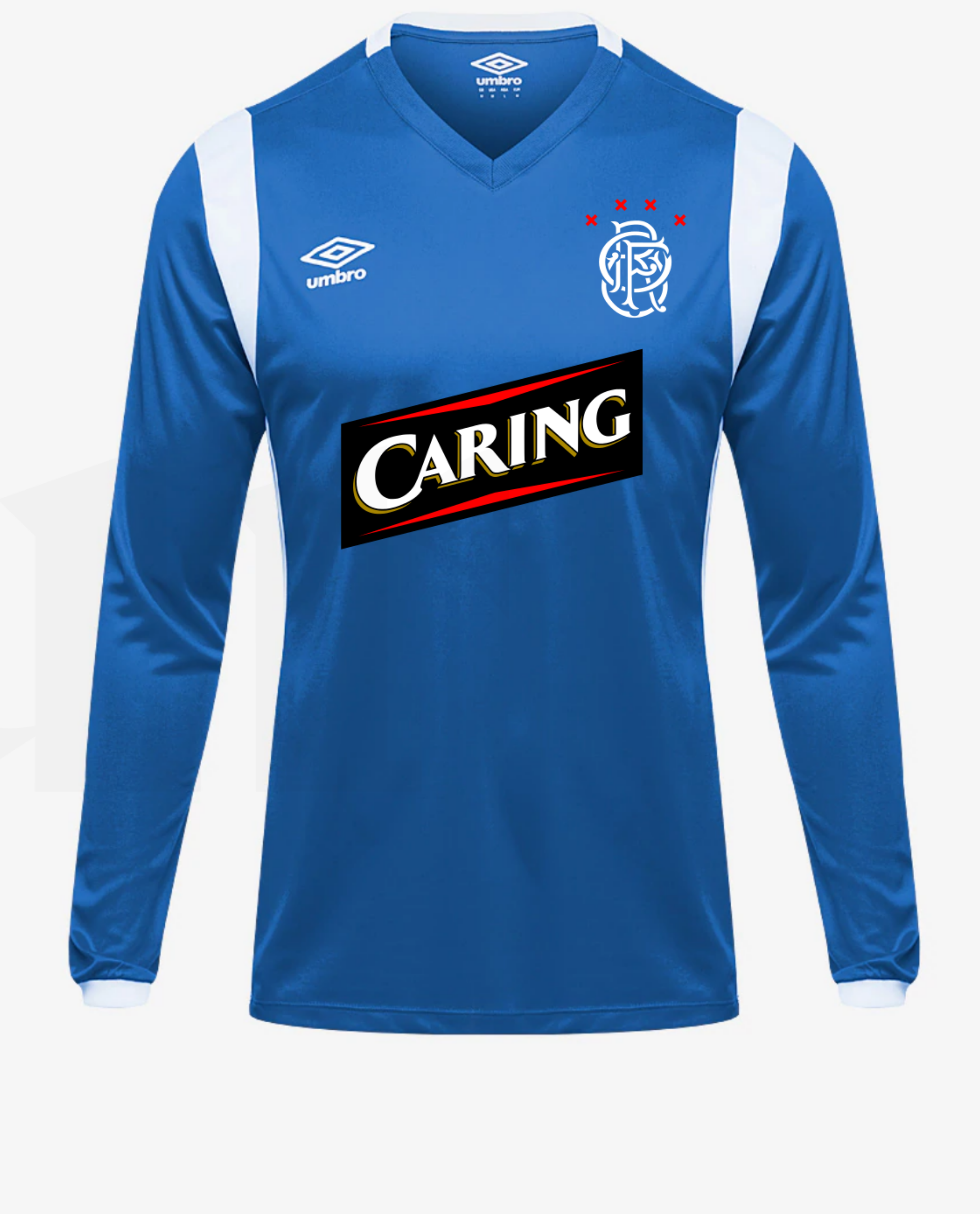 Found north of the border, these teamwear templates take all the vibes from the Rangers 2008 Double winning home shirt. Artist Corbin Shaw's bootleg "Caring" sponsor on the front. Reworked the Scroll crest to have the letters "RFC" & the Red stars, replaced with "FOUR" & the X insignia, and embroidered on the chest. Back number "4" in the same style as the 08 shirt. Short-sleeved Football Shirt cut from 100% Synthetic material. Sourced from Edinburgh, Scotland. Curated, handfinished in-house & Shipped from Berlin.